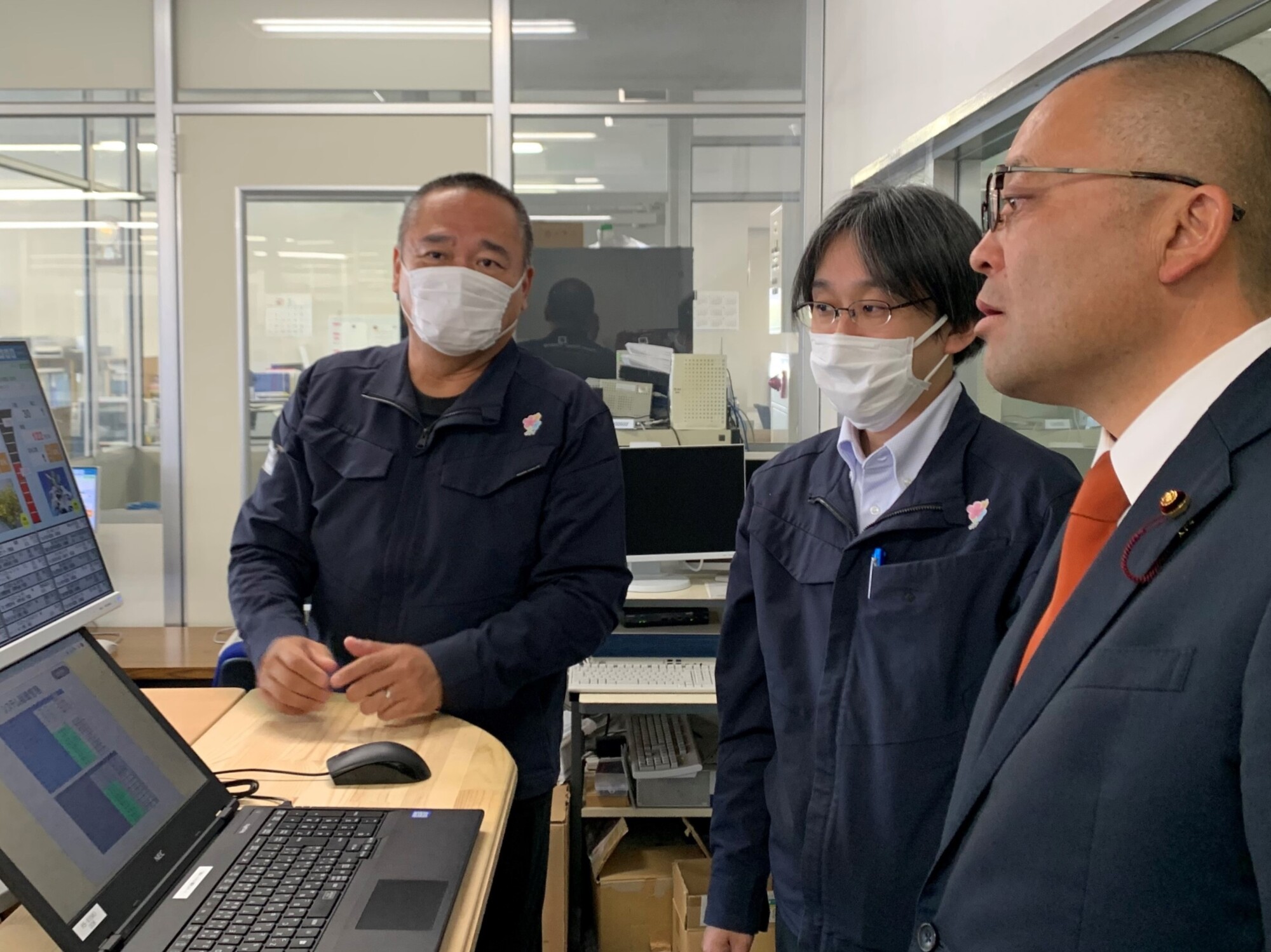 (柴山社長より、リモートオークションシステムのご説明を受ける金内)