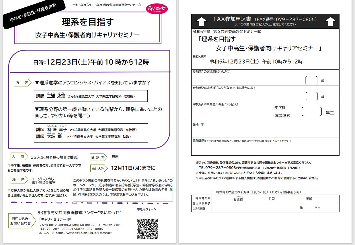 令和5年度 男女共同参画啓発セミナー「理系を目指す女子中高生・保護者向けキャリアセミナー」参加者募集! | 姫路市 (himeji.lg.jp)