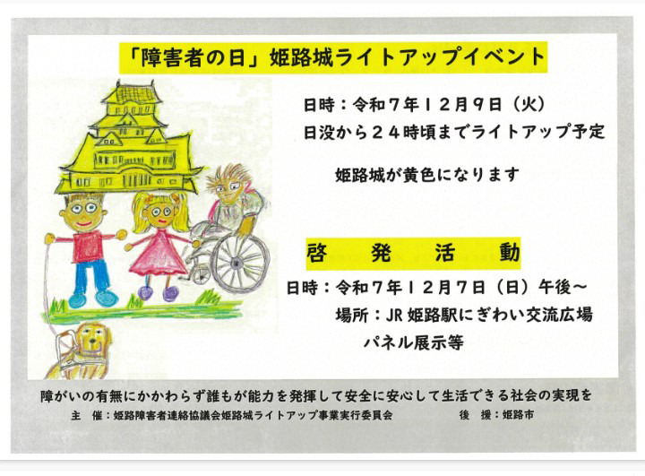 ブログ 02Dec2025 令和7年12月9日「障害者の日」に姫路城が黄色にライトアップされます。 「障害者の日」である12月9日に姫路城及びアクリエひめじが障害者権利条約の日本国内の普及、障害のある方々の社会参加促進運動(イエローリボン運動)のシンボルマークである黄色にライトアップされます。 「障害者の日」に、姫路城が黄色にライトアップされます。(令和7年12月9日) | 姫路市 毎年12月3日から12月9日までの1週間、国や地方公共団体などが中心となって障害者福祉に対する意識啓発のための様々な取り組みを実施する「障害者週間」です。 障害者週間には、障がい者への理解の促進とより積極的な社会・経済・文化への参加機会のため、国や自治体、企業、市民団体などが連携して全国各地でさまざまな催しを実施されます。 ブログ コメント: 0 12月はまちなかがもっと楽しくなる!「姫路ウォーカブル月間」を開催します 関連記事一覧 骨髄バンク支援クリスマスコンサート2023 第7回 播磨地区高校... 第38回ひめじぐるめらんどを開催します 姫路城・西小天守 冬の特別公開 【姫路市×PoliPoli Gov】姫路市の子育て支援サービスについて意... 前期企画展「ここが知りたい!外来生物の本当の問題」を開催し... 姫路市社会福祉事業団 職員募集! コメント ( 0 ) トラックバックは利用できません。 この記事へのコメントはありません。