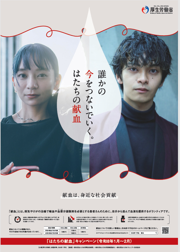 ブログ 20Jan2026 1〜2月は「はたちの献血」キャンペーン期間 〜冬に不足しがちな血液を守るために〜 寒さが厳しくなる1〜2月。実はこの時期、献血に協力する人が大きく減ることをご存じでしょうか。 血液は人工的に作れず、長期保存もできないため、日々の医療現場では安定した献血が欠かせません。 そんな状況を受けて、厚生労働省・都道府県・日本赤十字社は、令和8年1月1日〜2月28日の2か月間、若い世代に献血の大切さを伝える「はたちの献血」キャンペーンを実施しています。 2026年のテーマは「誰かの今をつないでいく。はたちの献血」 冬は血液が不足しがちな季節。この機会に、ぜひ一度献血について考えてみませんか。 あなたの一歩が、未来の医療を支える大きな力になります。 姫路みゆき献血ルーム|兵庫県赤十字血液センター|日本赤十字社 はたちの献血 ブログ コメント: 0 「戦後80年」をテーマにした2つの展示が開催されています 関連記事一覧 【熱中症予防の呼びかけ】猛暑が続く2025年夏、いま一度ご注意を! 満開の花 ペット……飼う前も、飼ってからも考えよう。 10月は姫路市食育月間です! 「姫路ゆかりの千姫フェスタ」が開催されます。 姫路市議会は25日から コメント ( 0 ) トラックバックは利用できません。 この記事へのコメントはありません。