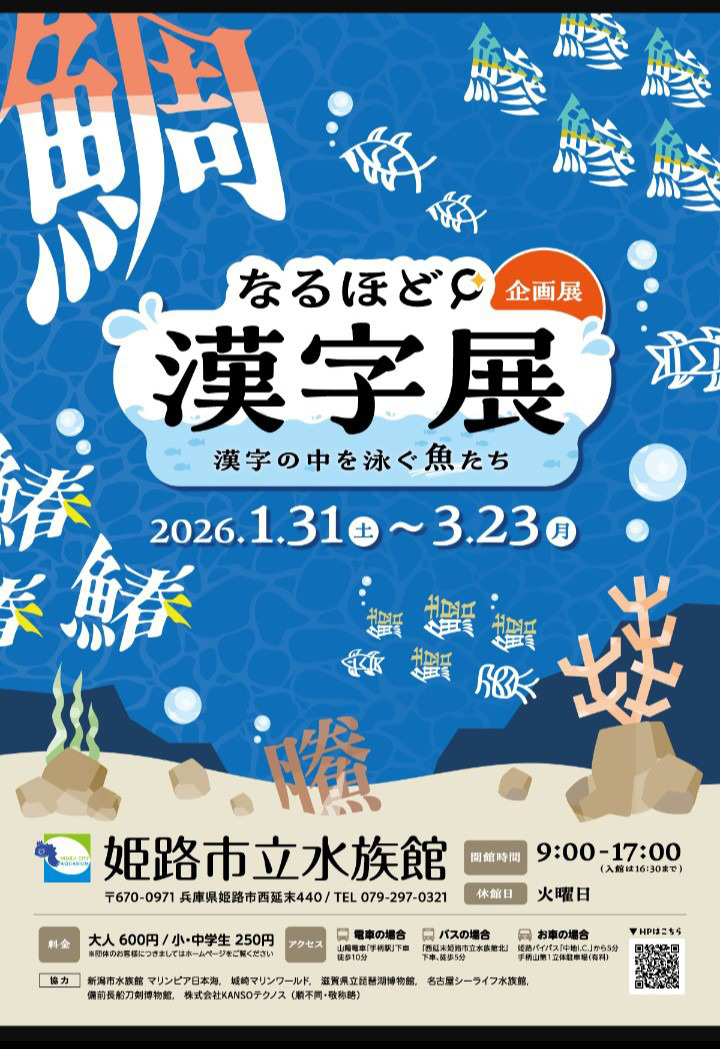 ブログ 30Jan2026 企画展のご案内「「なるほど漢字展」~漢字の中を泳ぐ魚たち~ 姫路市立水族館では、後期企画展「なるほど漢字展 ~漢字の中を泳ぐ魚たち~」を開催します。 日本は海に囲まれ、日常的に魚や水辺の生きものに触れる機会が多い国。 普段よく目にする「鮭」「鯛」「鯉」など、生活に深く根付いた“魚へんの漢字”に注目し、その漢字が表す生きものの姿や生態を紹介するユニークな展示となっています。 会場には、魚の標本やレプリカ、解説パネルが並び、「この漢字にはこんな意味があったんだ」「この魚はこんな生活をしているんだ」と、見ながら楽しく学べる内容になっています。 新館2階のギャラリーでは、姫路城大天守の「しゃちほこパネル」や魚へん漢字一覧表など、見て学べるコンテンツも充実しています。 企画展のご案内「「なるほど漢字展」~漢字の中を泳ぐ魚たち~ | 姫路市立水族館 後期企画展「なるほど漢字展」~漢字の中を泳ぐ魚たち~を開催します。 | 姫路市 ブログ コメント: 0 企画展「外国人の人権ー共生社会の実現に向けてー」 関連記事一覧 熱中症予防 姫路市内でサルが目撃されています。ご注意ください。 姫路城世界遺産登録30周年記念式典 令和6年度 姫路ゆかたまつりは6月22日(土)・6月23日(日)に... 今年もよろしくお願いいたします。 【環境について学ぼう!見つけよう!カーボンニュートラルのカギ】 コメント ( 0 ) トラックバックは利用できません。 この記事へのコメントはありません。