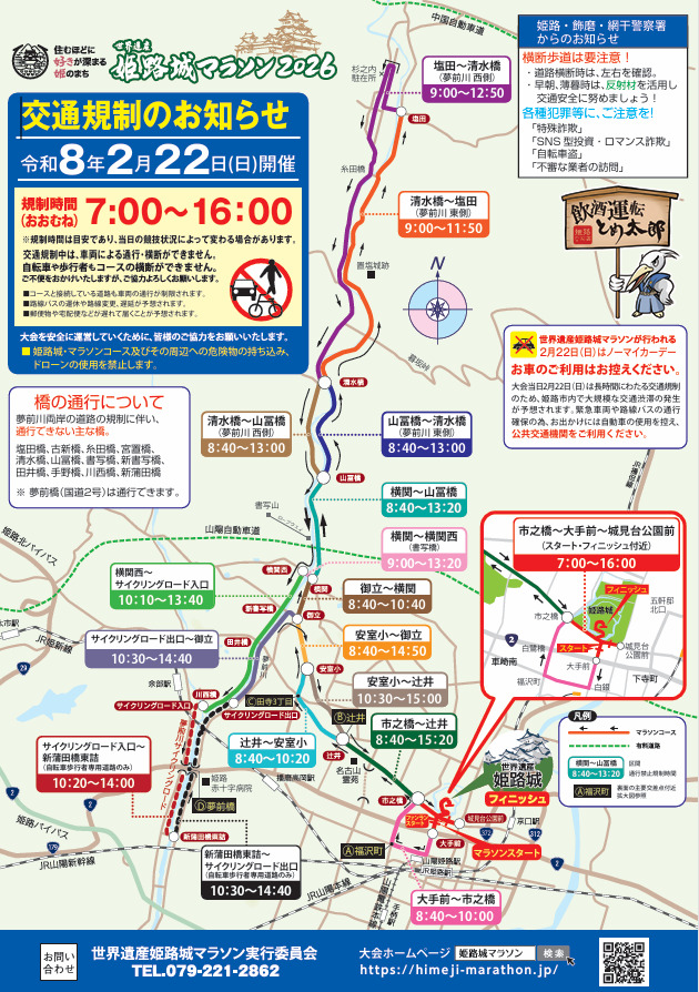 ブログ 09Feb2026 世界遺産姫路城マラソン2026 交通規制のお知らせ 大会当日の令和8年2月22日(日)は長時間にわたる広範囲な交通規制が行われ、姫路市内で大規模な交通渋滞の発生が予想されます。緊急車両や路線バスの通行確保のため、お出かけには車の使用を控え、公共交通機関をご利用いただきますようご協力をお願い申し上げます。 交通規制 | 世界遺産姫路城マラソン2026 ブログ コメント: 0 姫路市立あかつき中学校(夜間中学)生徒の募集について 関連記事一覧 住民税非課税世帯に対する1世帯あたり7万円の給付金 6月の姫路城ライトアップ 姫路市社会福祉事業団 職員(事務員)募集!! 7月は「社会を明るくする運動」 の強調月間&再犯防止啓発月間 9月1日は防災の日!もしもに備えて防災対策の見直しを プラスチック製容器包装に異物を混ぜないでください コメント ( 0 ) トラックバックは利用できません。 この記事へのコメントはありません。