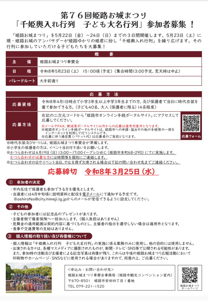 ブログ 26Feb2026 🏯第76回姫路お城まつり「千姫輿入れ行列 子ども大名行列」の参加者募集 第76回姫路お城まつりを令和8年5月22日(金)から24日(日)までの 3日間開催します。 2日目の23日(土曜日)午後3時頃(予定)より大手前通りにて 現・姫路お城のアンバサダーが姫路ゆかりの姫君に扮し 「千姫輿入れ行列 子ども大名行列」を繰り広げます。 その行列に子ども大名として参加いただける子どもたちを大募集します。 ■ 申込方法 募集期間(令和8年2月18日~3月25日)内に、姫路市オンライン手続ポータルサイトから応募。 第76回姫路お城まつり「千姫輿入れ行列 子ども大名行列」の参加者募集について | 姫路市 姫路市|姫路お城まつり公式サイト 姫路大名行列 | 姫路市 ブログ コメント: 0 姫路城・城周辺施設の料金改定とデジタルチケット本格運用について 関連記事一覧 「書写山 もみじまつり」を開催します。 第16回皮革フェアを開催します(見野の郷交流館) 令和6年度 市政モニター募集 8月1日「水の日」に姫路城等をシアン色にライトアップします 12月はまちなかがもっと楽しくなる!「姫路ウォーカブル月間」... 「姫路ゆかりの千姫フェスタ」が開催されます。 コメント ( 0 ) トラックバックは利用できません。 この記事へのコメントはありません。