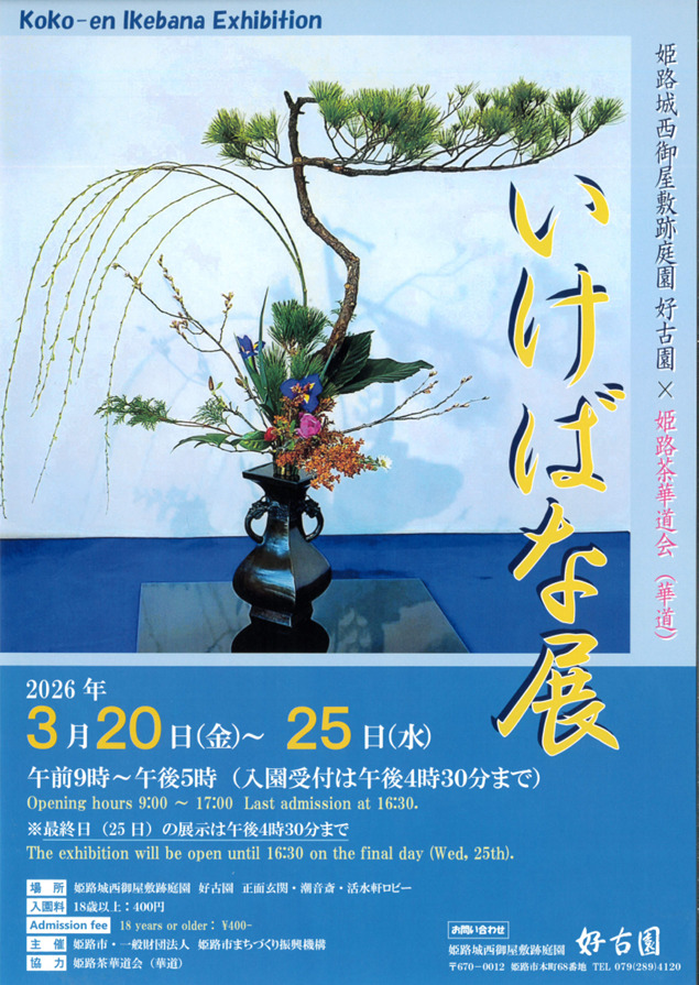 ブログ 09Mar2026 【好古園】いけばな展 伝統的な生け花から近代的な生け花まで、姫路茶華道会の作品を展示します。 〚開催日時〛 3月20日(金)~25日(水) / 9:00~17:00 (入園受付は16:30まで) ※最終日 (25日)の展示は16:30まで 〚開催場所〛 姫路城西御屋敷跡庭園 好古園 (正面玄関・潮音斎・活水軒ロビー) 〚入園料〛※新入園料になっています 18歳以上:400円 / 18歳未満:無料 【好古園】いけばな展 | イベント | ひめのみち ブログ コメント: 0 見せます!体験できます!姫路のものづくり「第22回技能フェスタ2026」 関連記事一覧 水道管の凍結にご注意ください!! 障害者差別解消法周知イベント【知ろう 出会おう つながろう... 手柄山温室植物園で「県農生のカトレア原種展」を開催します 令和5年度姫路市広報アンケート調査 STOP!コロナ差別 姫路市立美術館「精神のきらめき-西洋美術を中心に-」 コメント ( 0 ) トラックバックは利用できません。 この記事へのコメントはありません。