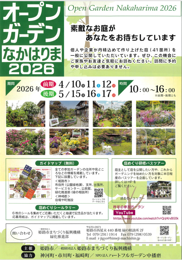 ブログ 24Mar2026 オープンガーデンなかはりま2026 姫路のまちが花と緑でいっそう輝く季節、「オープンガーデンなかはりま」が今年もスタートします。 4月はチューリップやパンジーなど春らしいカラフルな庭が、5月にはバラやクレマチスの香り豊かな庭が登場し、訪れるたびに違った表情を楽しめます。市内の個人邸や企業が大切に育てた庭を自由に巡りながら、春の彩りと香りを楽しめる人気イベント。散歩気分で、心ほどけるガーデンめぐりへ出かけてみませんか。 📅 開催日 (いずれも10:00〜16:00) 【前期】• 4月10日(金)• 4月11日(土)• 4月12日(日) 【後期】• 5月15日(金)• 5月16日(土)• 5月17日(日) 市内の個人宅や企業など41か所の庭が参加。庭主さんが丹精込めて育てた花々や緑が一斉に開き、訪れる人を迎えてくれます。ナチュラルガーデン、バラが主役の庭、手作りのガーデン雑貨が並ぶ庭など、どの庭も個性豊かで見応えたっぷり。自由に巡ることができ、予約や申し込みは不要で楽しむことができます。 オープンガーデンなかはりま | 一般財団法人姫路市まちづくり振興機構 オープンガーデンなかはりま2026 | イベント | ひめのみち ブログ コメント: 0 【大手前公園】第40回記念「ひめじぐるめらんど」 姫路駅・姫路城周辺 関連記事一覧 【参加者募集】企業向け女性活躍推進セミナーを開催します 姫路市産業デジタル化支援補助金のご案内 姫路科学館の企画展「くらべてわかる!アンモナイト」 こころの健康フォーラム 市民共創プラットフォームにて市民意見を募集しています 2025年「ひめじ夏のボランティア体験」の参加者(学生)を募集し... コメント ( 0 ) トラックバックは利用できません。 この記事へのコメントはありません。