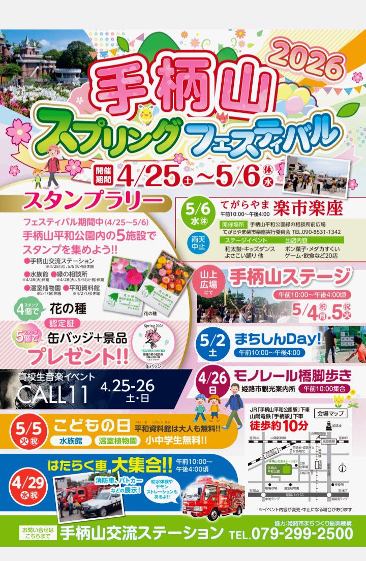 ブログ 03Apr2026 手柄山スプリングフェスティバル2026 姫路市の春を彩る「手柄山スプリングフェスティバル2026」 家族で、友人と、そして一人でも楽しめる多彩なイベントが4月25日から5月6日まで開催されます。 スタンプラリーや音楽ライブ、働く車の展示、飲食ブースなど、子どもから大人まで楽しめる企画が盛りだくさん。 市民にとって身近な手柄山が、期間中は“遊び・学び・体験”の拠点へと変わります。自然、音楽、体験イベントがそろったこの季節ならではのにぎわいを、ぜひ現地で感じてみてください。 🌼 施設めぐりで楽しむスタンプラリー 手柄山エリアの5つの施設を巡るスタンプラリーが実施されます。 4つ以上集めると「花の種」、5つすべて巡ると「手柄山マスター認定缶バッジ」と景品がもらえる特別企画です。散策しながら自然や展示を楽しめるのが魅力です。 🎵 高校生ライブや働く車の展示も 期間中は、若いエネルギーあふれる高校生ライブや、子どもたちに人気の「働く車」展示など、見どころがいっぱい。消防車やパトカーの展示、運転席体験など、家族で楽しめるイベントがそろっています。 🍡 週末は屋台も登場 土日祝には、たこ焼きやクッキー、コーヒーなどの飲食ブースが並びます。手柄山の自然の中で、のんびり食べ歩きするのもおすすめです。 手柄山スプリングフェスティバル2026 | 姫路市 手柄山スプリングフェスティバル2026 | イベント | 【公式】姫路観光ナビ ひめのみち ブログ コメント: 0 【姫路文学館】特別展「漫画家生活30周年 こうの史代展~鳥がとび、ウサギもはねて... 関連記事一覧 市民意見(パブリック・コメント)の募集② 生涯学習大 健康体操講座のご案内 2022手柄山オータムフェスティバルを開催します 姫路おもてなしクーポンキャンペーン 特別展「没後50年 姫路が生んだ二人の作家 阿部知二と椎名麟... 愛の血液助け合い運動月間 コメント ( 0 ) トラックバックは利用できません。 この記事へのコメントはありません。