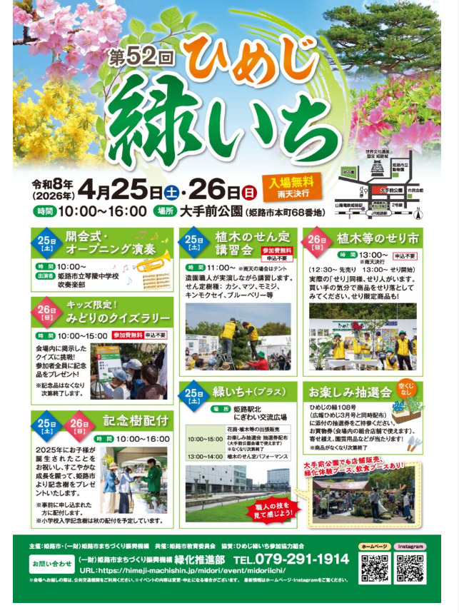 ブログ 10Apr2026 第52回ひめじ緑いち【大手前公園:2026年4月25日(土)・26日(日)】 🌿 家族でふらりと出かけたくなる「ひめじ緑いち」の季節がやってきました。大手前公園や駅前広場が、緑や花、そして人のにぎわいでふんわり彩られるイベントです。 気持ちのいい季節、家族でのんびり楽しむ時間をぜひ。 🌸 親子でワクワク!自然とふれあう体験がいっぱい 子どもたちの“初めての体験”にもぴったりのプロの造園家による緑化展示やワークショップが催されたり、 植木のせり市や体験型ブースなど、普段できない体験ができるのも魅力です。 🎶 会場に広がるにぎやかな雰囲気 中学生や高校生によるステージパフォーマンスもあり、会場はとても華やか。 家族でのんびり散策しながら、音楽やパフォーマンスを楽しめます。 🍽️ グルメも充実!家族でシェアしたくなる味がいっぱい 会場内には、パン、スイーツ、軽食などの出店が並び、食べ歩きも楽しみのひとつ。子どもが喜ぶメニューも多く、家族みんなで満足できます。 🎁 ちょっと嬉しいお楽しみ企画も 会場を巡るだけでワクワクするような抽選会やクイズラリーなど、子どもが夢中になる企画も開催。 ひめじ緑いち | 一般財団法人姫路市まちづくり振興機構 【大手前公園】第52回ひめじ緑いち | イベント | 【公式】姫路観光ナビ ひめのみち ブログ コメント: 0 再配達の削減に取り組みましょう。住宅用宅配ボックスの設置をご検討ください。 関連記事一覧 令和8年春季全国火災予防運動の実施 市民共創プラットフォームにて市民意見を募集します(姫路市に... 8/19・20 「これから100年の姫路のまちづくりを考える」Himej... 令和7年度「ひめじ大交流会」を開催します! 第36回全国陶器市のご案内 「髙田賢三展 パリに燃ゆ、永遠の革命児」が開催されています! コメント ( 0 ) トラックバックは利用できません。 この記事へのコメントはありません。