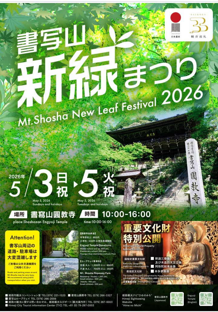 ブログ 20Apr2026 令和8年度「書写山新緑まつり」を開催します 🌿書写山 新緑まつり 開催 春の風が心地よくなり、新緑がいちばん輝く季節。 ロープウェイで空中散歩を楽しみながら山上へ向かえば、爽やかな風と木々の香りが迎えてくれ、 書写山はまるで緑の海に包まれたような美しさになります。 期間中はキッチンカーや露店も登場し、まさに“春のおでかけ日和”にぴったりのイベントです。 ■開催期間:令和8年5月3日(日祝)~5月5日(火祝) 午前10時から午後4時まで ■開催場所:書寫山圓教寺 🏛 特別公開について 期間中、国指定重要文化財や県指定文化財が特別公開されます。 普段は見ることのできない貴重な文化財を間近で鑑賞できる、またとない機会です。 ※天候により公開が中止となる場合があります。 令和8年度「書写山新緑まつり」を開催します | 姫路市 【書寫山圓教寺】書写山新緑まつり2026 | イベント | 【公式】姫路観光ナビ ひめのみち ブログ コメント: 0 かなうちよしかず市政報告 Vol.08ができました! 5月17日は世界高血圧デーです 関連記事一覧 令和6年度こども手話教室 児童文学講演会のお知らせ 家内に 「人間将棋 姫路の陣」の開催について 市民共創プラットフォームにて市民意見を募集します(姫路市に... 手柄山スプリングフェスティバルが開催されます。 コメント ( 0 ) トラックバックは利用できません。 この記事へのコメントはありません。